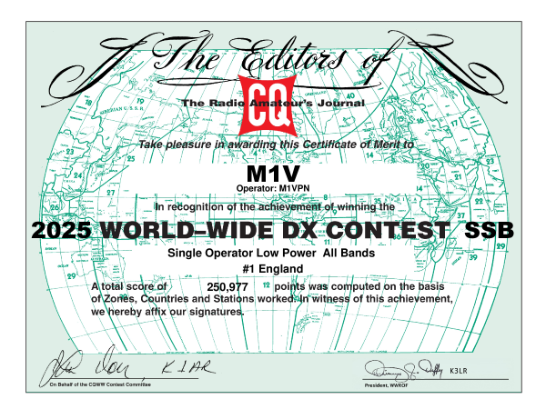 CQ WW Contest M1V, #1 in England, SOAB Low Power.